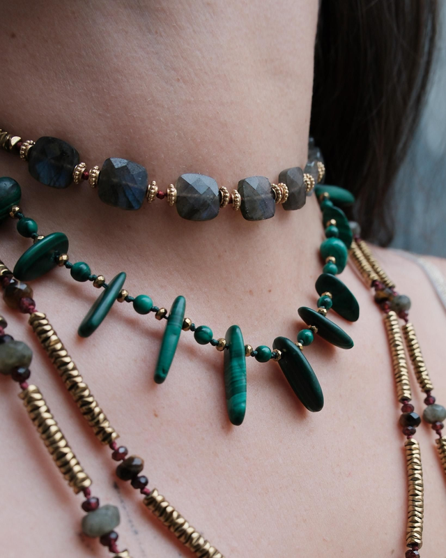 Chaque pierre porte une histoire : la Labradorite, irisée comme une aurore boréale, sert de bouclier émotionnel, et révèle les vérités cachées. L’Œil-de-Tigre, doré et chatoyant, insuffle courage et clarté. Les Hématites dorées, ancrées dans la terre, recyclent les énergies négatives en force vitale.