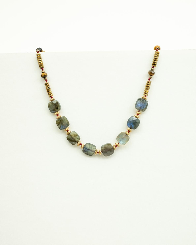 Ce collier en Labradorites, Œil-de-Tigre & Hématites dorées est monté à la main, selon la technique des bijoux premiers. Le fil de Jade, de couleur prune (1mm) est noué entre chaque pierres, inspiré de la puissance des Malas Tibétains.