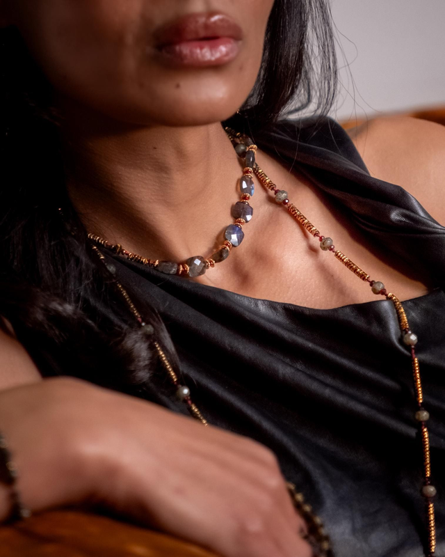 Chaque pierre porte une histoire : la Labradorite, irisée comme une aurore boréale, sert de bouclier émotionnel, et révèle les vérités cachées. L’Œil-de-Tigre, doré et chatoyant, insuffle courage et clarté. Les Hématites dorées, ancrées dans la terre, recyclent les énergies négatives en force vitale.